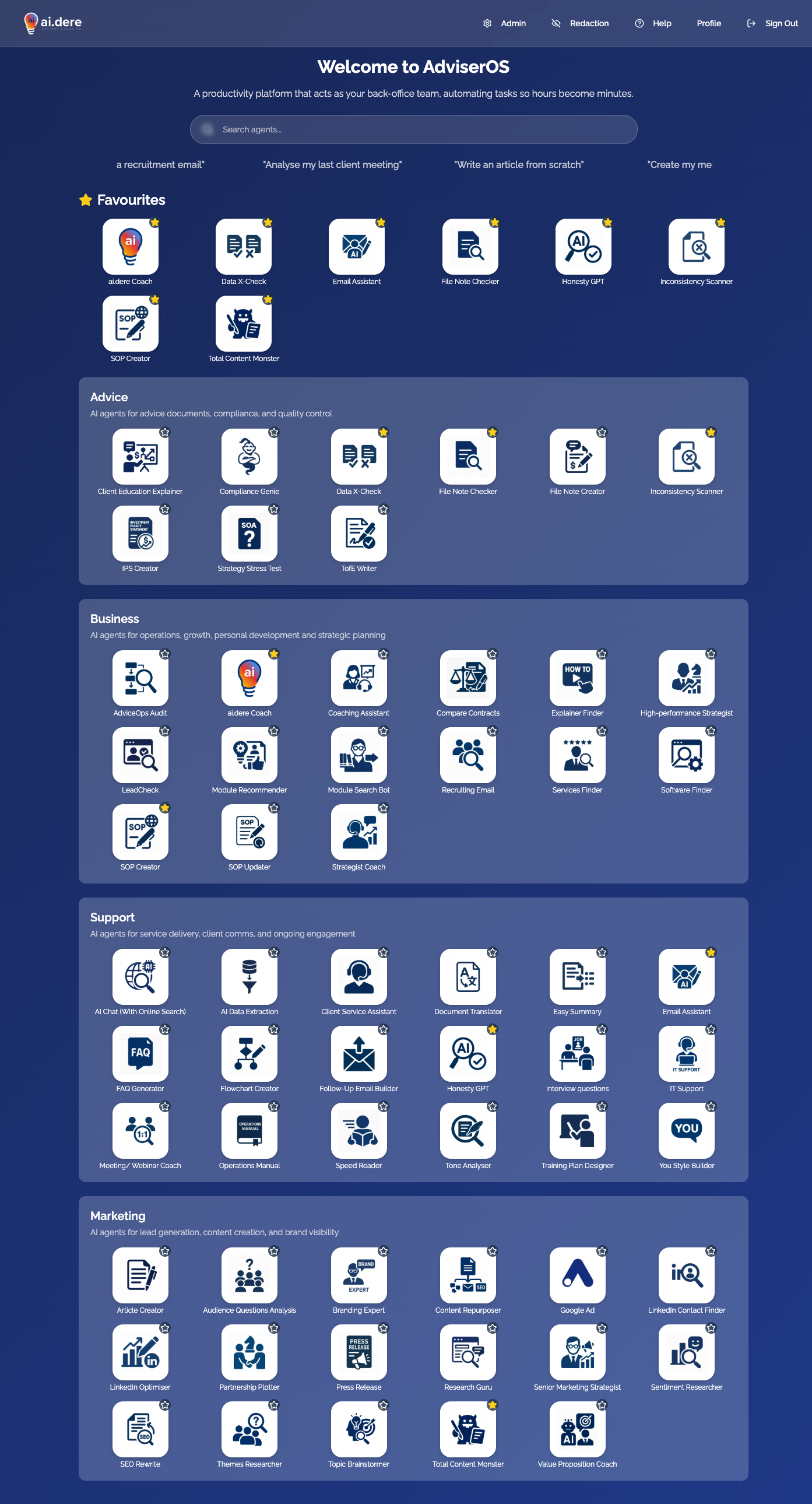 ai.dere is an AI-powered platform designed for financial advisers, accountants, and mortgage brokers. It provides a suite of AI agents to assist with compliance, administration, business growth, marketing, and more.